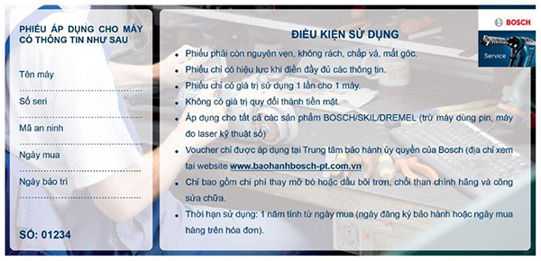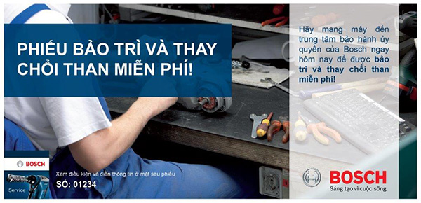 • Ngoài ra, 200 khách hàng đầu tiên mua máy Bosch bất kì trên trang www.lazada.vn/bosch-uu-dai-tu-hang/ (trừ máy dùng pin, máy đo lases kĩ thuật số, phụ kiện) sẽ nhận ngay phiếu bảo trì & chổi than miễn phí.